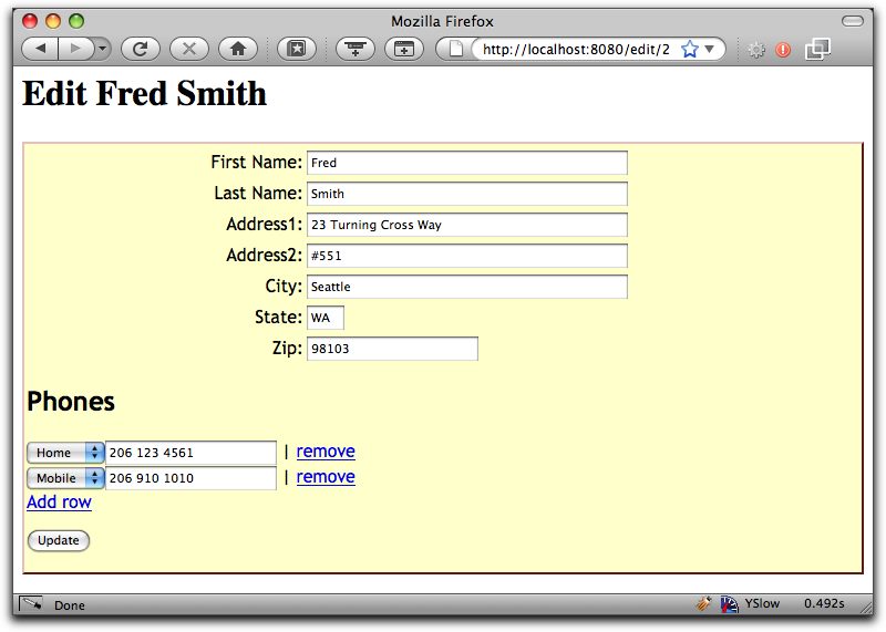 <html xmlns:t="http://tapestry.apache.org/schema/tapestry_5_0_0.xsd"> <body> <h1>Edit ${person.firstName} ${person.lastName}</h1> <t:form t:id="form"> <t:errors/> <div class="t-beaneditor"> <t:beaneditor t:id="person"/> <h2>Phones</h2> <div t:type="ajaxformloop" t:id="phones" source="person.phones" value="phone"> <t:select t:id="type" value="phone.type"/> <t:textfield t:id="number" value="phone.number"/> | <t:removerowlink>remove</t:removerowlink> </div> <p> <input type="submit" value="Update"/> </p> </div> </t:form> </body> </html>Here we're editing the direct properties of the Person object and adding a section below to allow the phones for the person to be edited. The AjaxFormLoop looks much like a Loop component here, except we must provide a PrimaryKeyEncoder object.