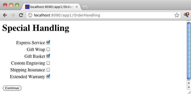 <html xmlns:t="http://tapestry.apache.org/schema/tapestry_5_3.xsd"> <body> <h1>Special Handling</h1> <t:form> <t:checklist t:id="handling" encoder="encoder" model="model"/> <br/> <input type="submit" value="Continue"/> </t:form> </body> </html>Here we are able to omit the selected parameter (the list of selected items) because the Checklist component's id matches a property of the page.