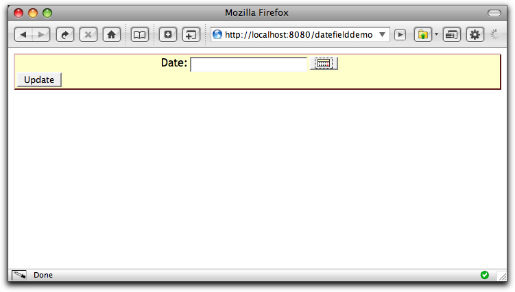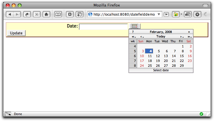 The DateField component is very easy to use, all the JavaScript is generated for you. Then end result looks like: