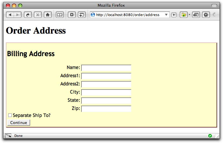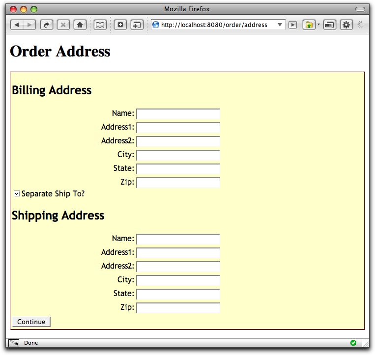 <html xmlns:t="http://tapestry.apache.org/schema/tapestry_5_0_0.xsd"> <body> <h1>Order Address</h1> <t:form t:id="order"> <t:errors/> <div class="t-beaneditor"> <h2>Billing Address</h2> <t:beaneditor t:id="billingAddress"/> <t:checkbox t:id="separateShipTo" t:mixins="triggerfragment" fragment="separateShippingAddress"/> <t:label for="separateShipTo">Separate Ship To?</t:label> <t:formfragment t:id="separateShippingAddress" visible="separateShipTo"> <h2>Shipping Address</h2> <t:beaneditor t:id="shippingAddress"/> </t:formfragment> <div class="t-beaneditor-row"> <input type="submit" value="Continue"/> </div> </div> </t:form> </body> </html>The separateShipTo property is initially null, so the FormFragment is initially invisible. The BeanEditor and all of the individual fields are rendered, but the
