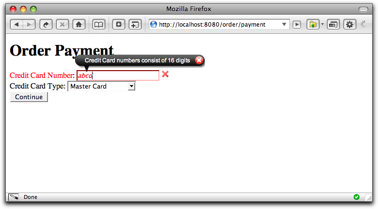 <t:label for="cardNumber"/>: <t:textfield t:id="cardNumber" validate="required,regexp" size="20"/>The validate parameter is used to specify validations for the field. When it is omitted, the @Validate annotation of the property is used (if present). In any case, this references two of the built-in validations: "required" and "regexp".